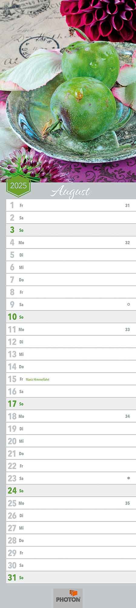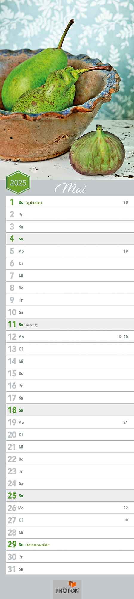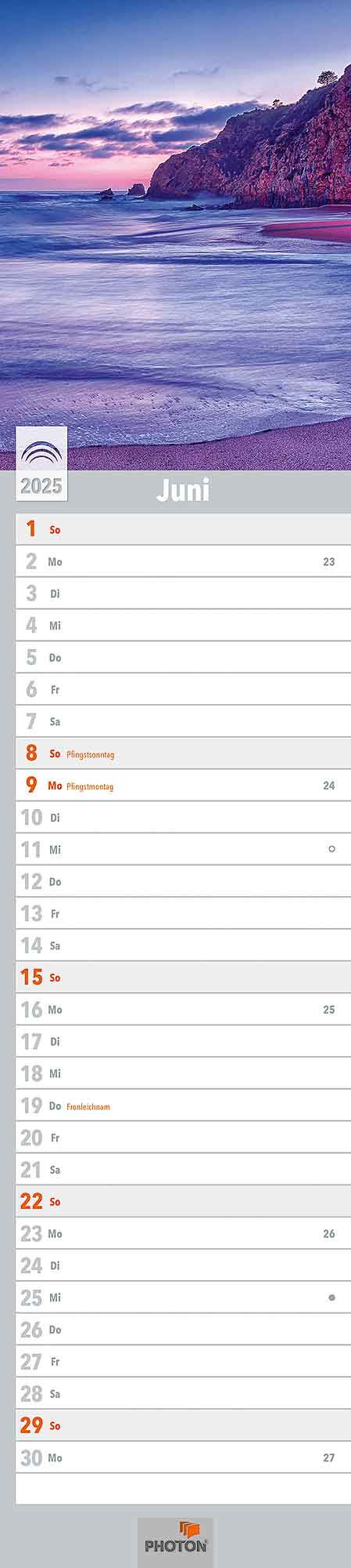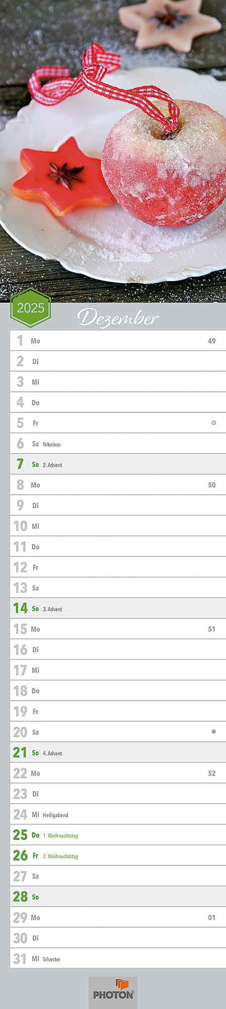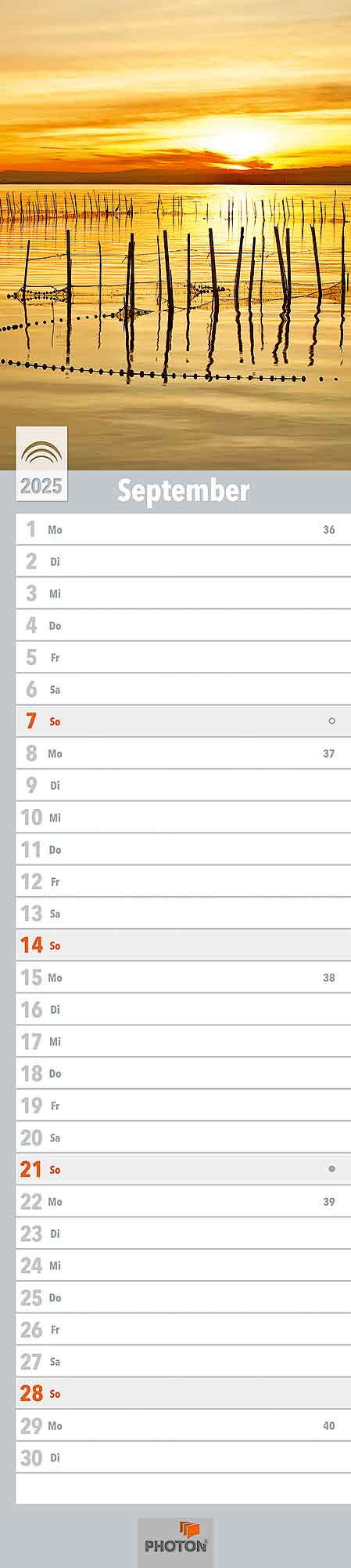 Inspirierende und entspannende Ansichten begleiten Sie das ganze Jahr mit unserem stimmungsvollen Streifenkalender. Dieser praktische Kalender bietet viel Platz für Ihre Notizen, Geburtstage, Gedenktage, Jubiläen und Feste. Kalendarische Details wie Feiertags-, Mondphasen- und Wochenangaben runden diesen praktischen Helfer ab.