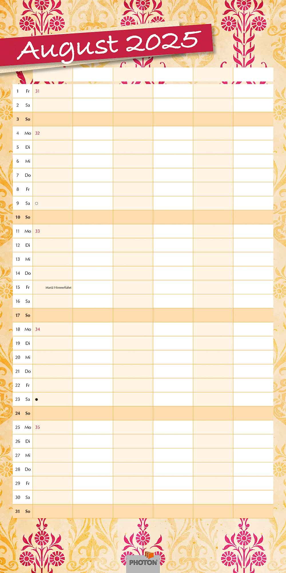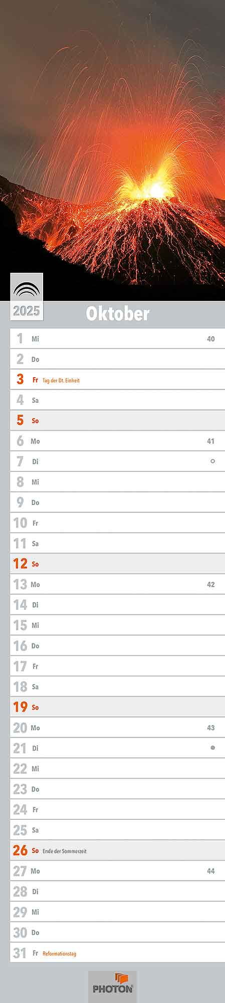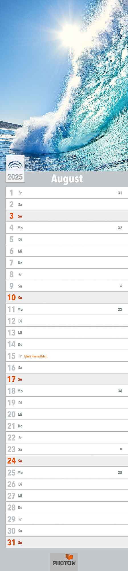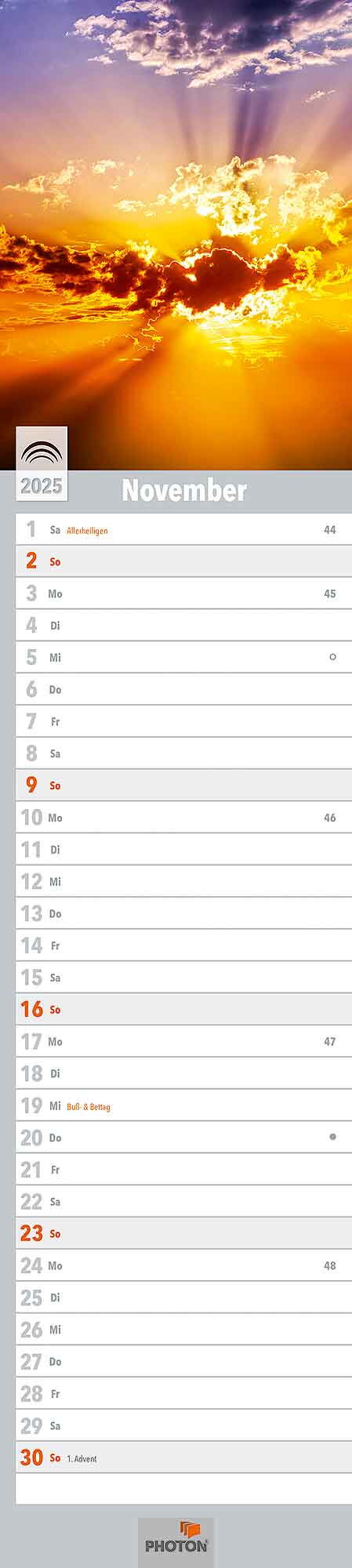 Inspirierende und entspannende Ansichten begleiten Sie das ganze Jahr mit unserem stimmungsvollen Streifenkalender. Dieser praktische Kalender bietet viel Platz für Ihre Notizen, Geburtstage, Gedenktage, Jubiläen und Feste. Kalendarische Details wie Feiertags-, Mondphasen- und Wochenangaben runden diesen praktischen Helfer ab.