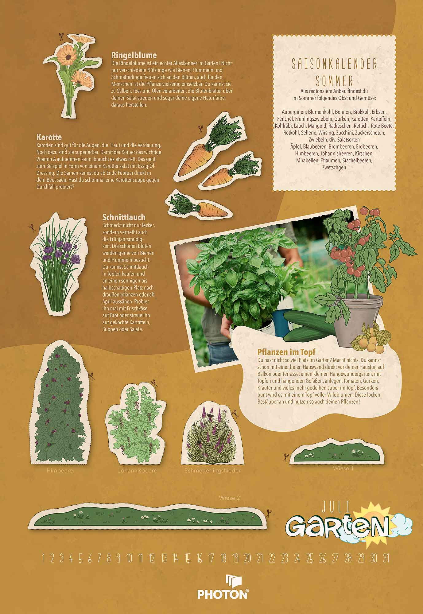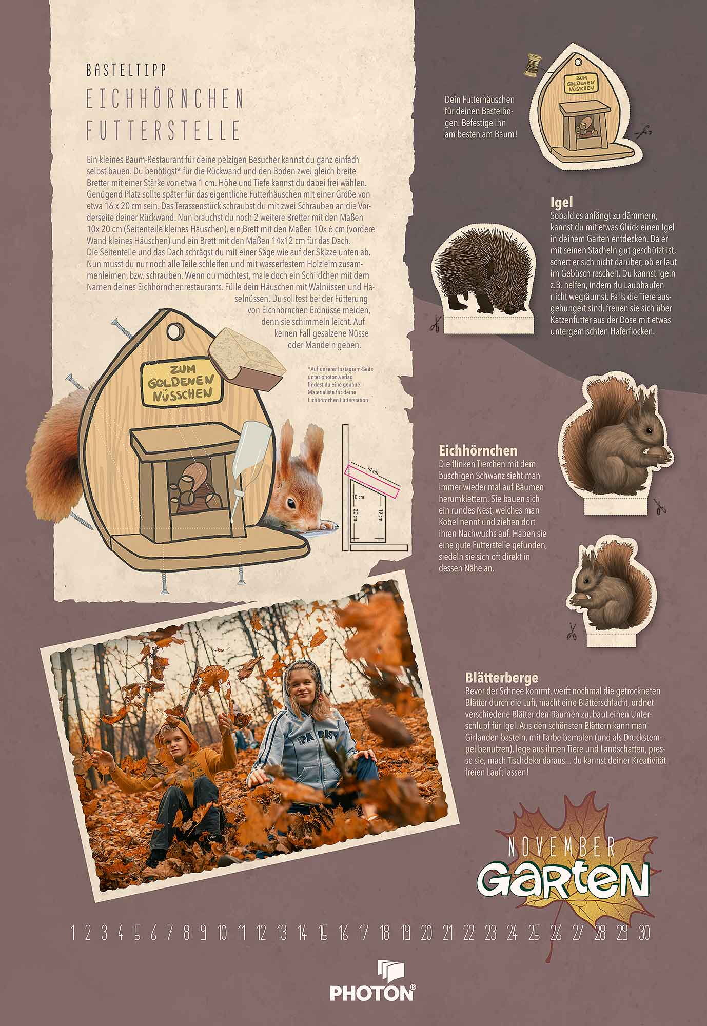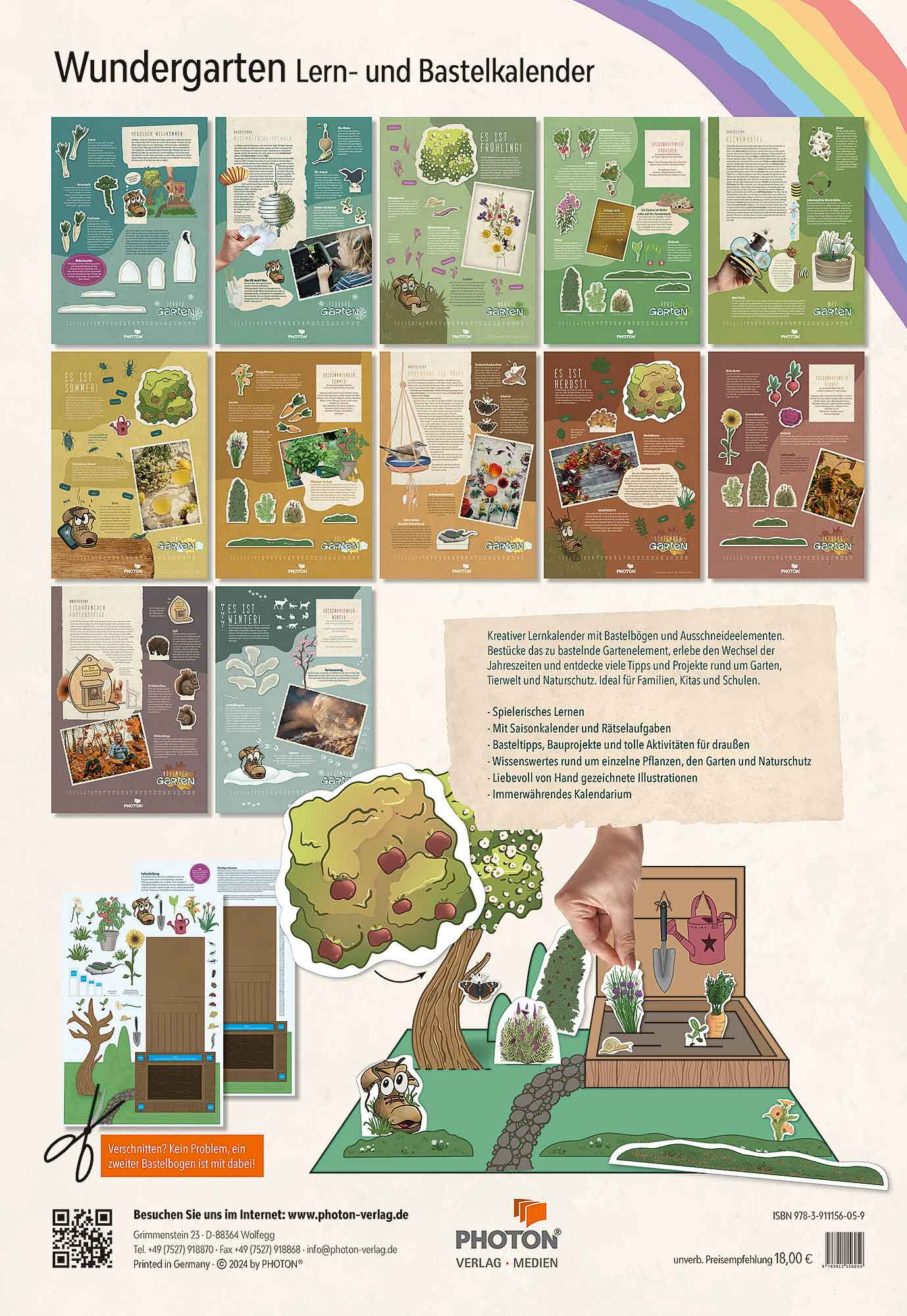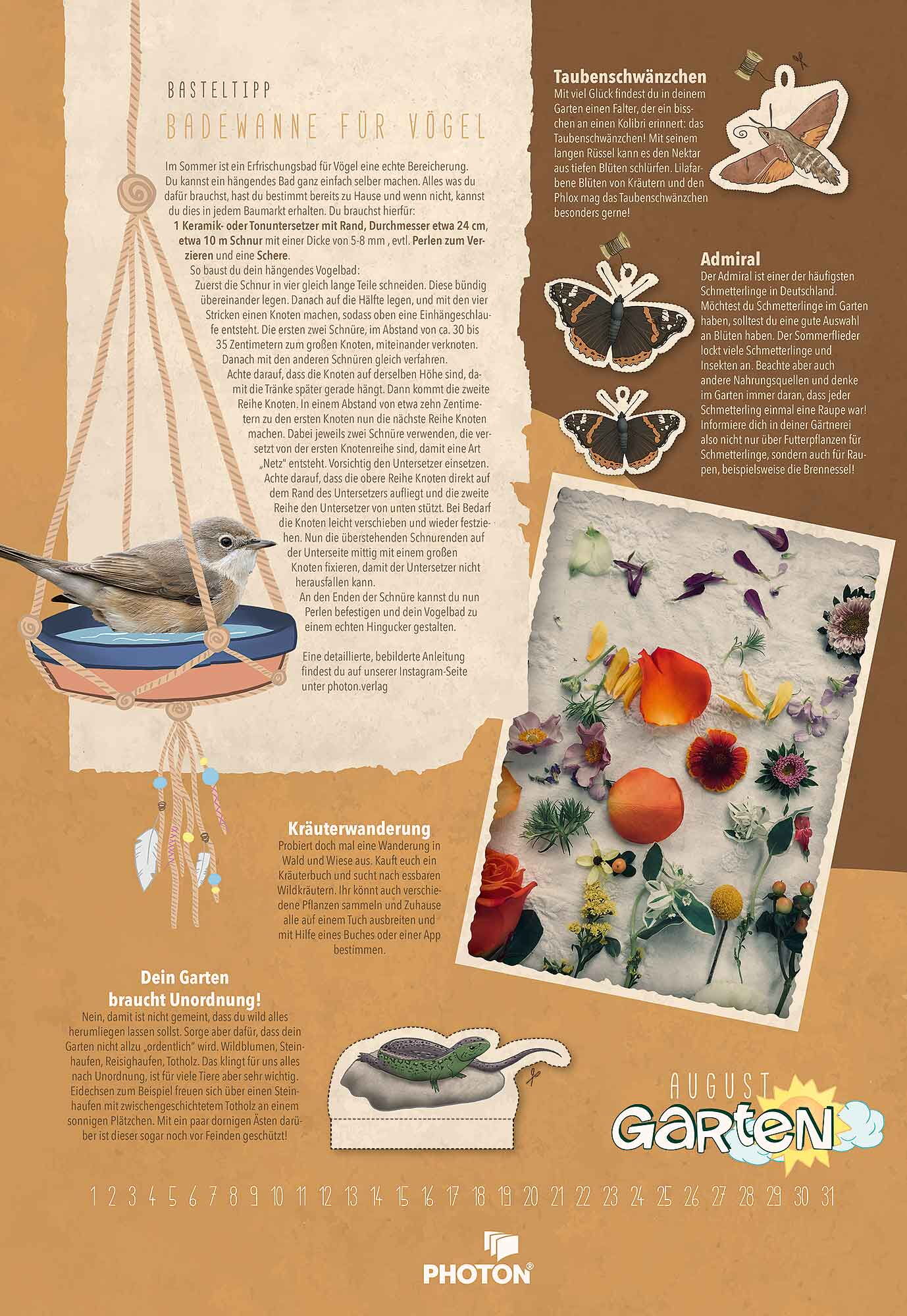 Bestücke Deinen Garten, erlebe den Wechsel der Jahreszeiten und entdecke viele Tipps und Projekte Rund um deinen Garten, die Tierwelt und den Naturschutz. Alle Motive exklusiv nur bei PHOTON - ein besonderer Kalender mit immerwährendem Kalendarium.
