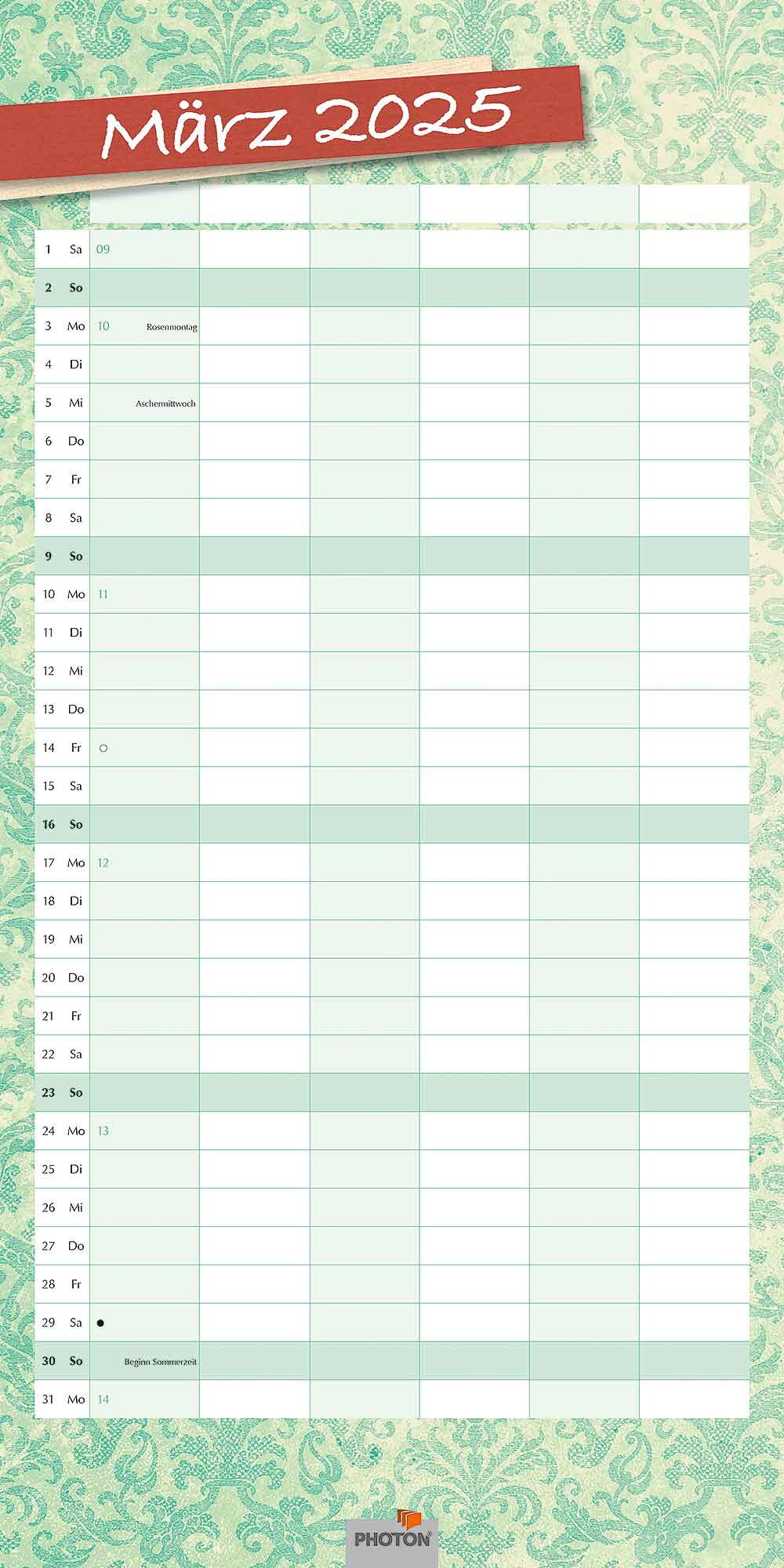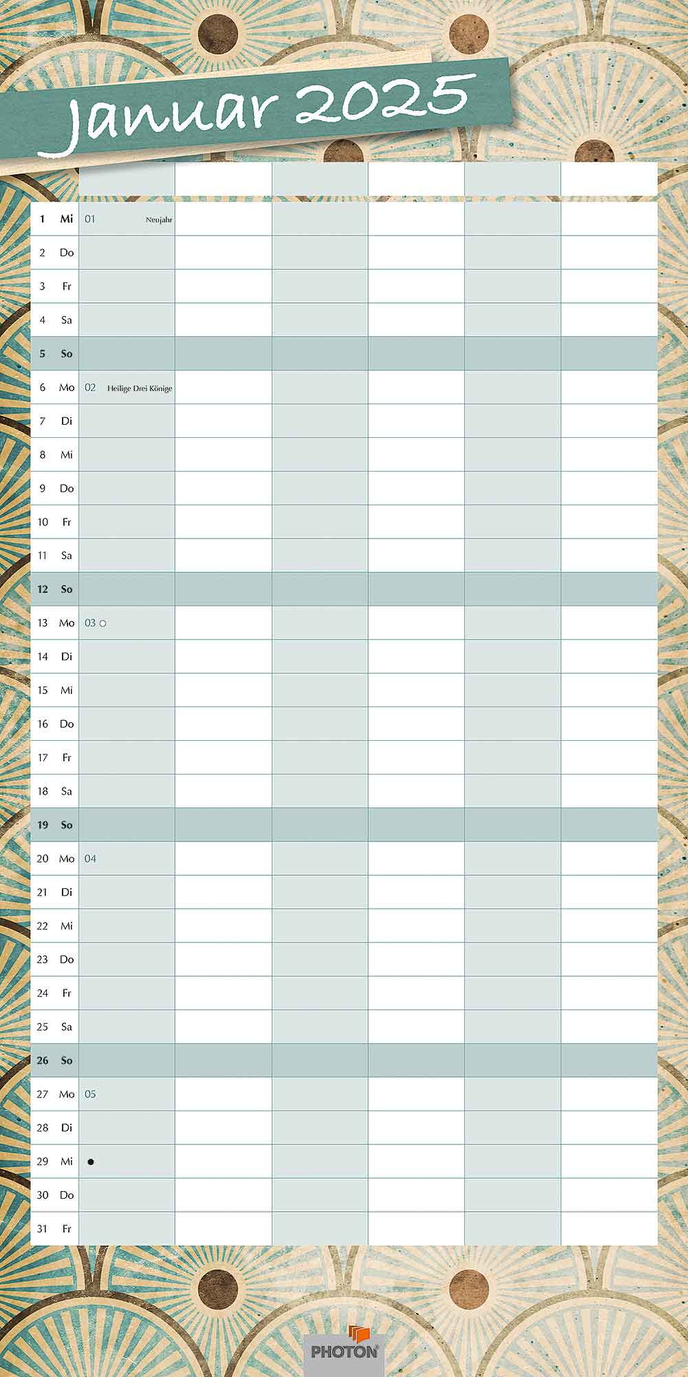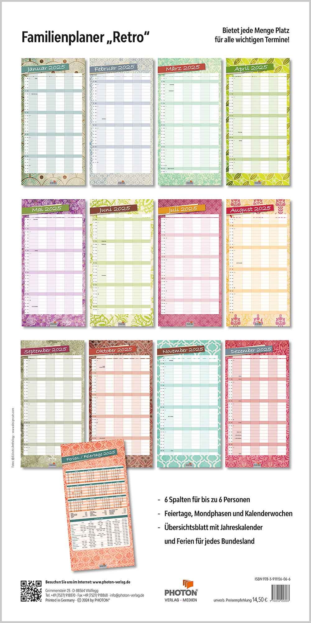 6 Spalten inklusive Mondphasen, Feiertags- und Wochenangaben sowie Jahresübersicht mit Ferienplan.