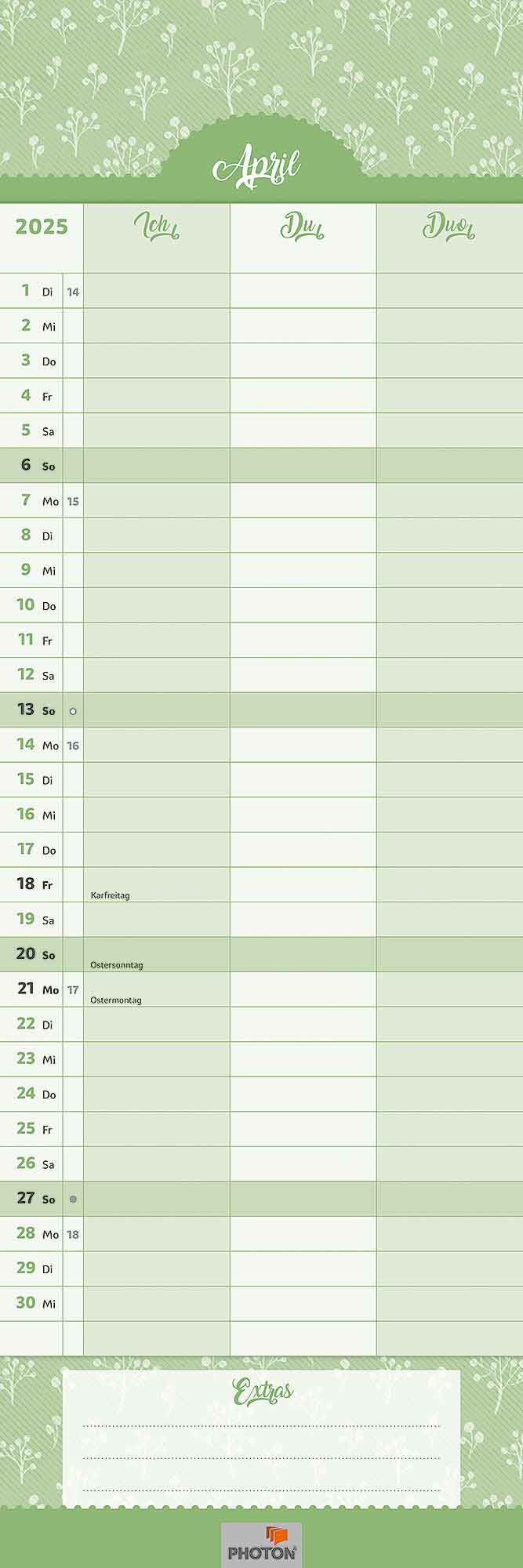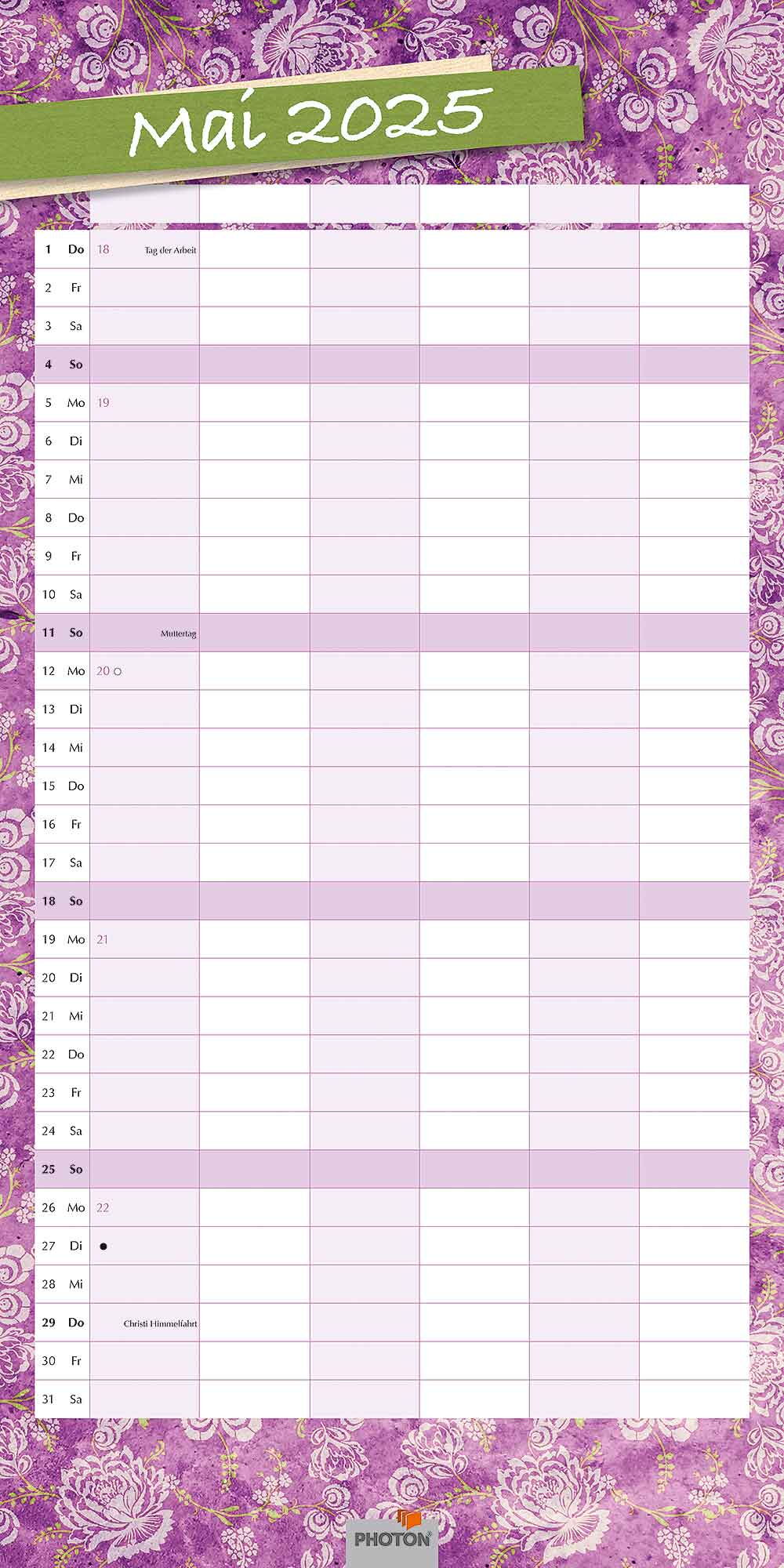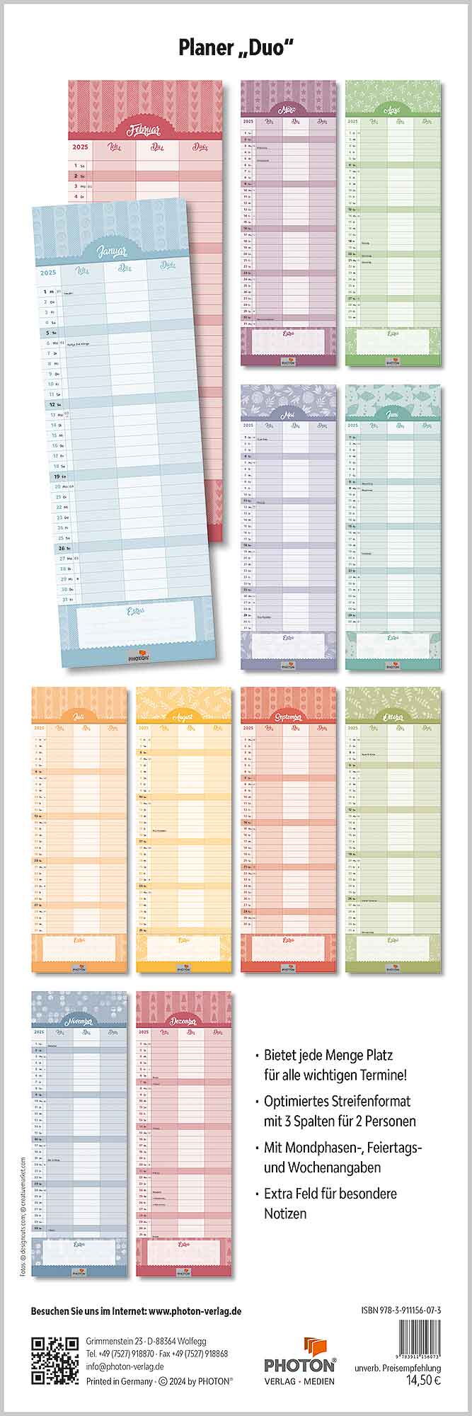 Für jeden und für gemeinsame Dates. Damit werden garantiert keine Einladungen, Geburtstage oder wichtige Termine mehr vergessen. Inklusive Feiertags-, Mondphasen-, und Wochenangaben bietet der Kalender reichlich Platz für alle Termine des Jahres. Ein nützlicher Helfer – fröhlich und ansprechend.