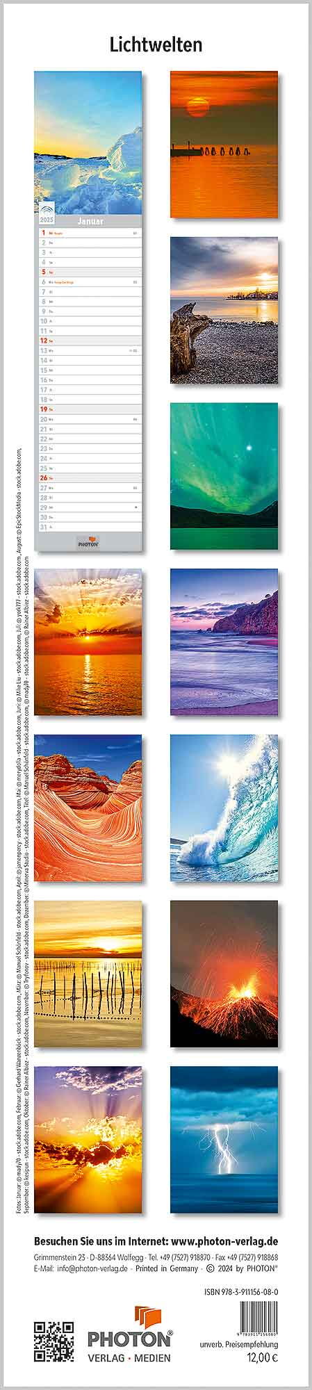 Sehnsuchtsorte und Plätze zum Träumen, das sind die Motive des praktischen Streifenkalenders. Wunderschöne Ansichten begleiten Sie das ganze Jahr. Dieser praktische Kalender bietet viel Platz für Ihre Notizen, Geburtstage, Gedenktage, Jubiläen und Feste. Kalendarische Details wie Feiertags-, Mondphasen- und Wochenangaben runden diesen praktischen Helfer ab.