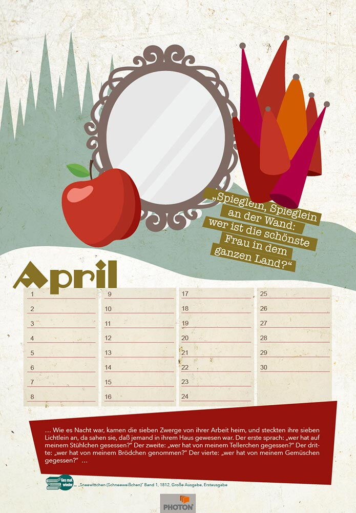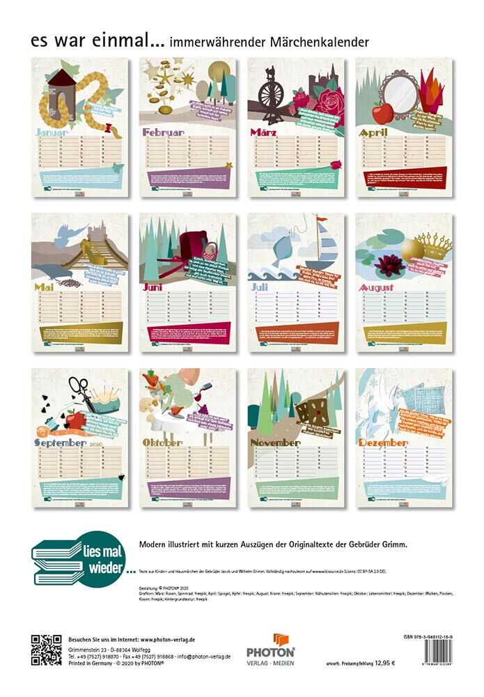 Mit dem märchenhaften immerwährenden Kalender haben Sie alle Geburtstage und wichtige wiederkehrende Ereignisse von Familienmitgliedern, Freunden und Bekannten stets im Blick. Jeder Monat bietet eine beliebte Geschichte der Gebrüder Grimm und nimmt Sie mit, in die facettenreiche Welt der Märchen.