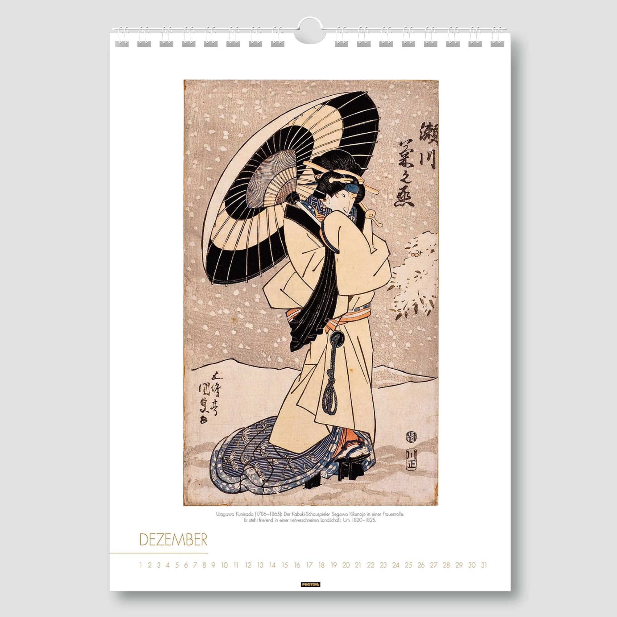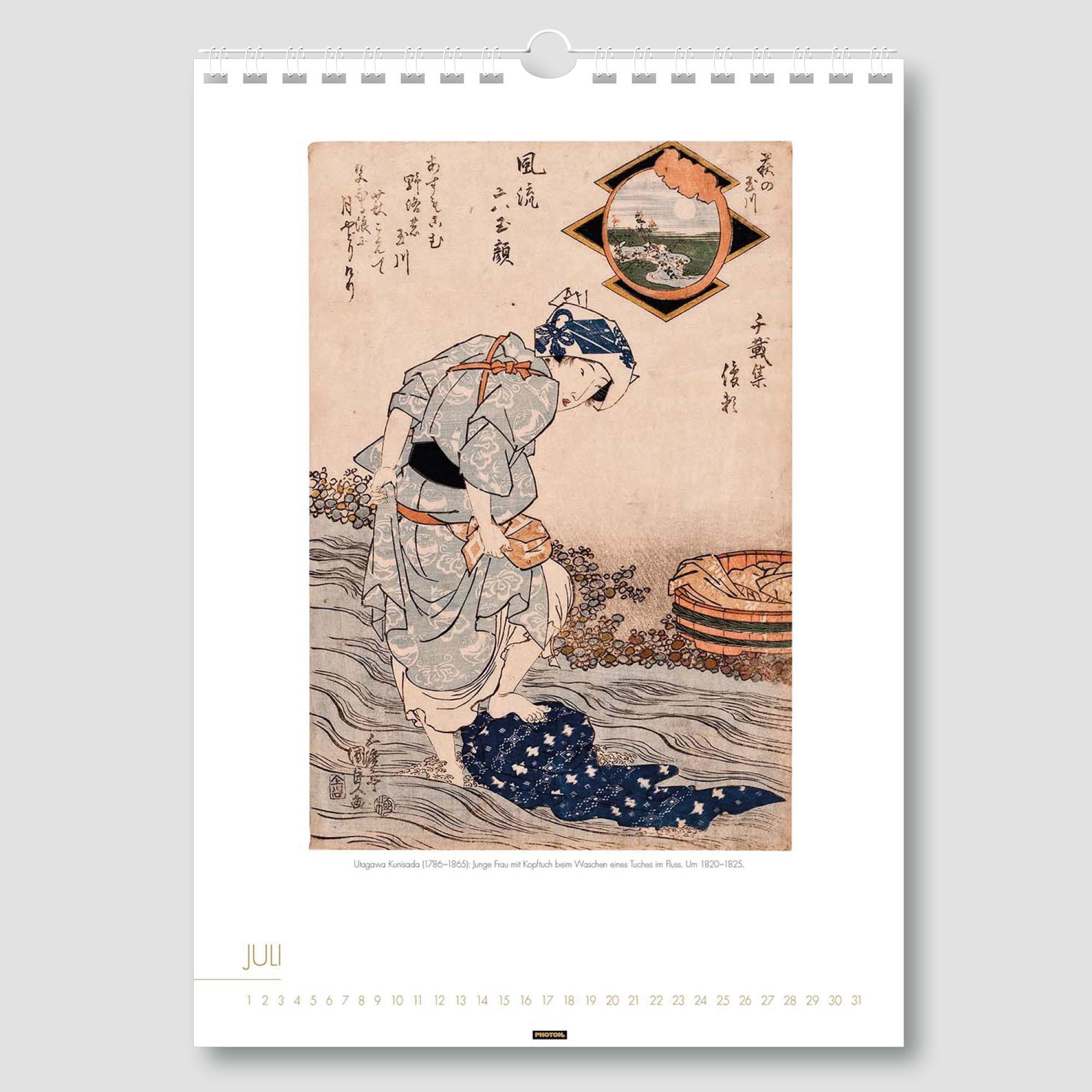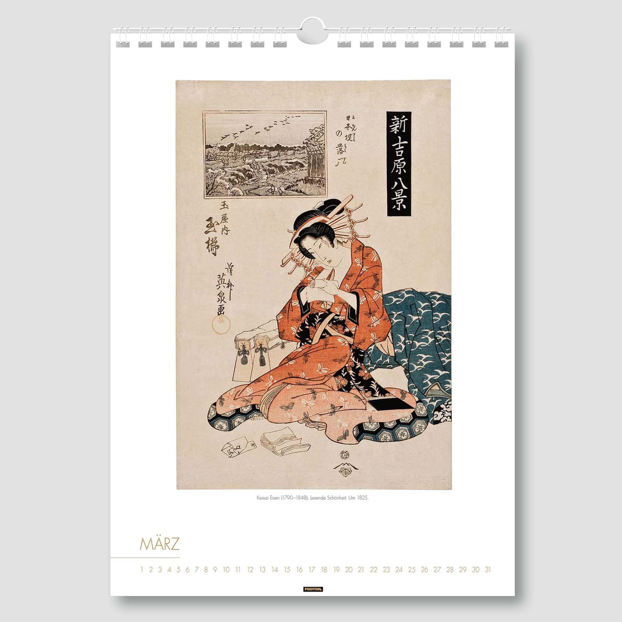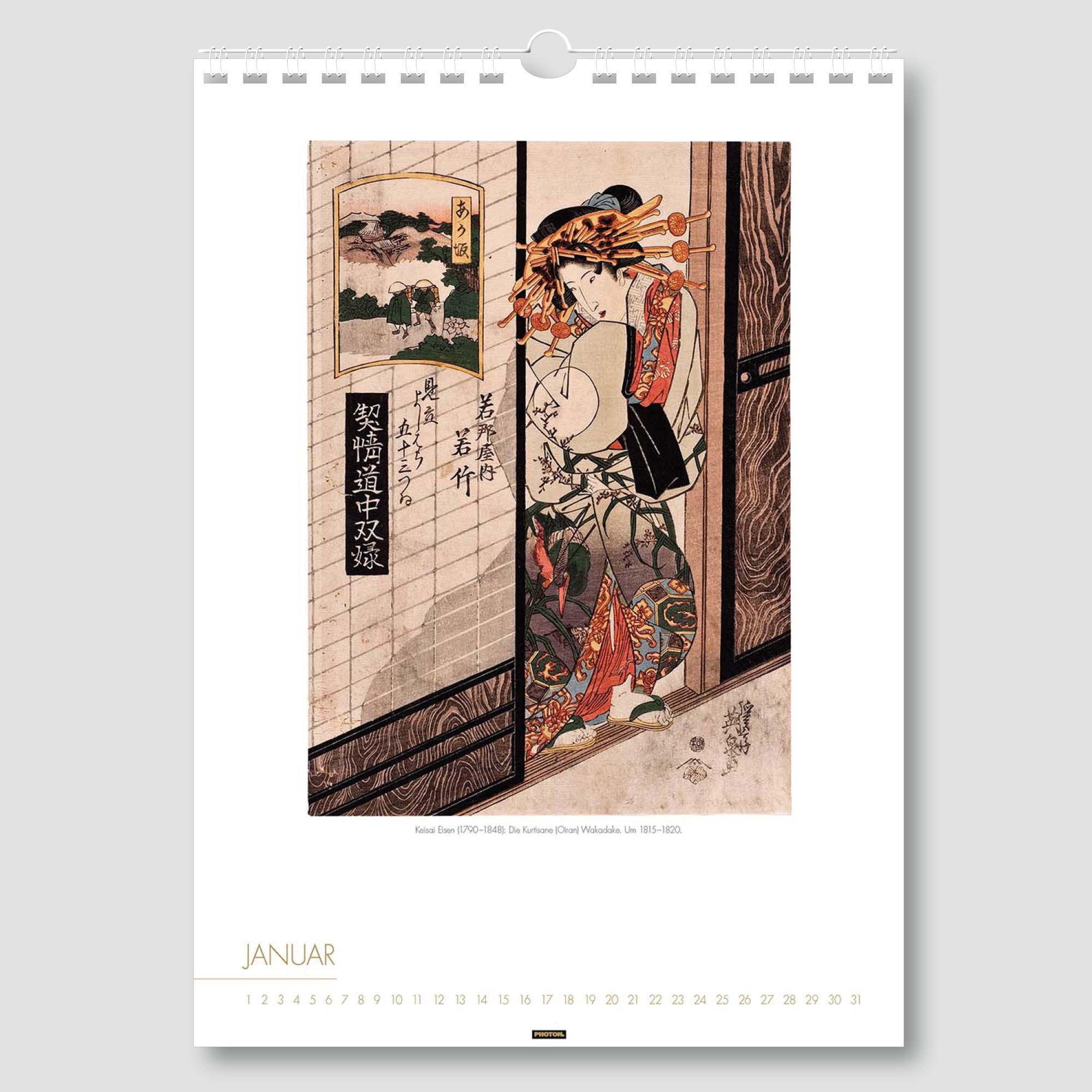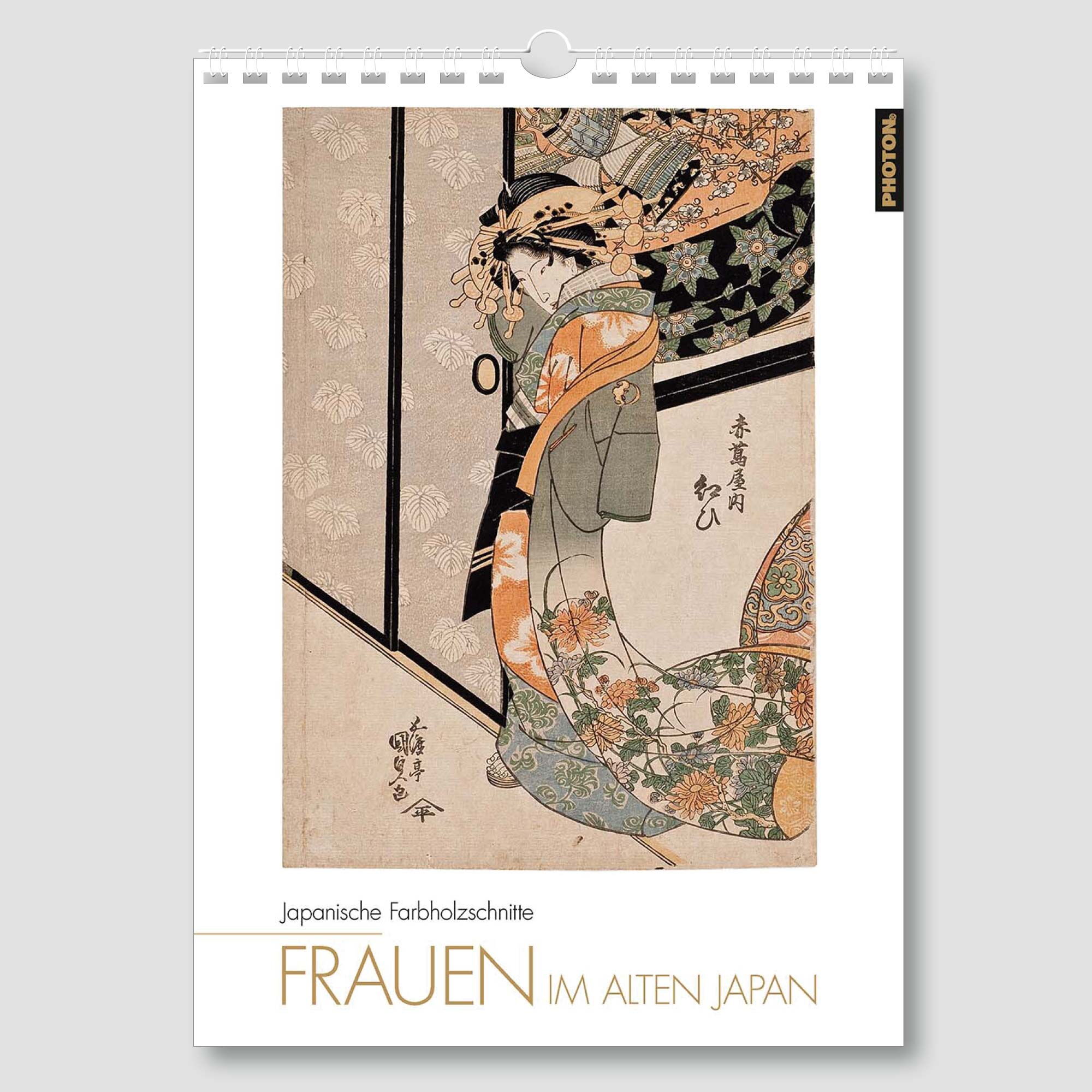 Der Kalender „FRAUEN IM ALTEN JAPAN“ fällt besonders ins Auge, führt er zurück in die Blütezeit des japanischen Farbholzschnittes im 18. und 19. Jahrhundert. Das Zentrum dieser druckgrafischen Kunst war Edo, das heutige Tokio. Großer Beliebtheit erfreuten sich die Darstellungen schöner Frauen, die in prächtigen Gewändern auftraten, besonders die von Kurtisanen aus dem Vergnügungsviertel der Hauptstadt. Noch heute fasziniert diese Kunst den Betrachter.