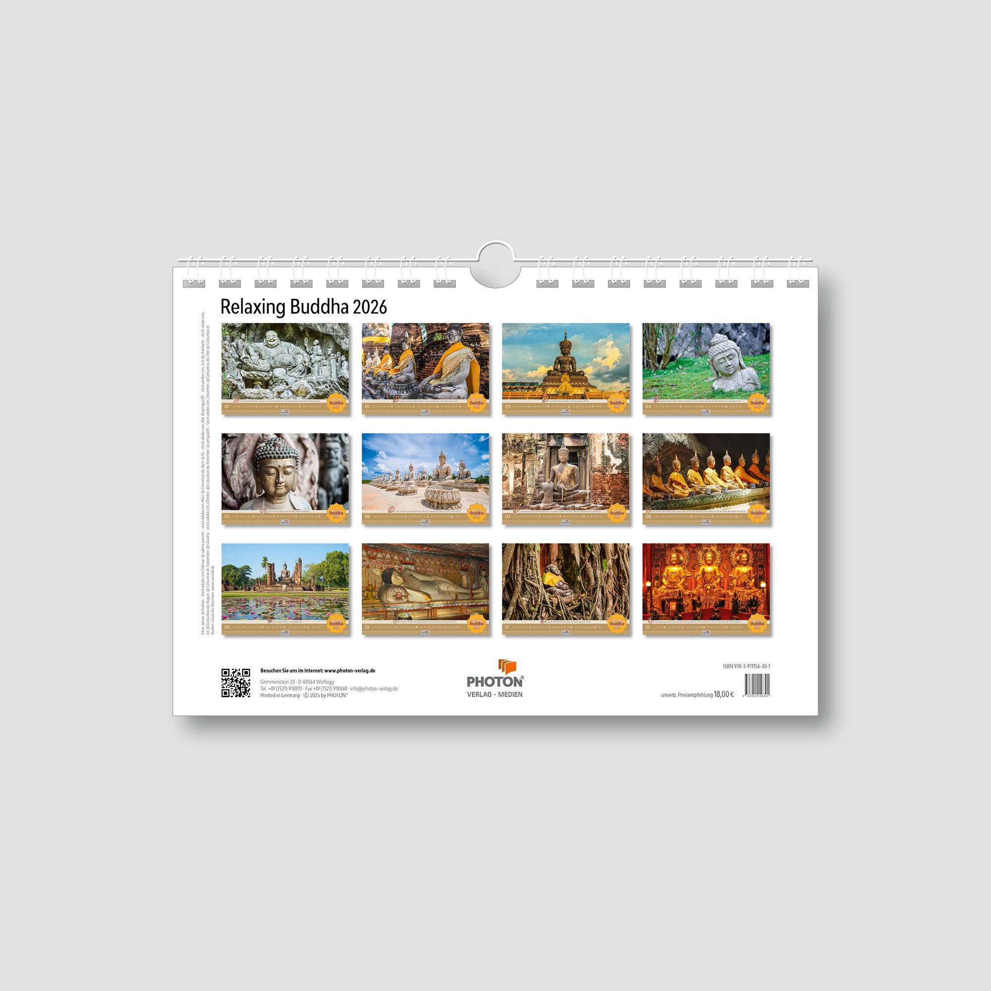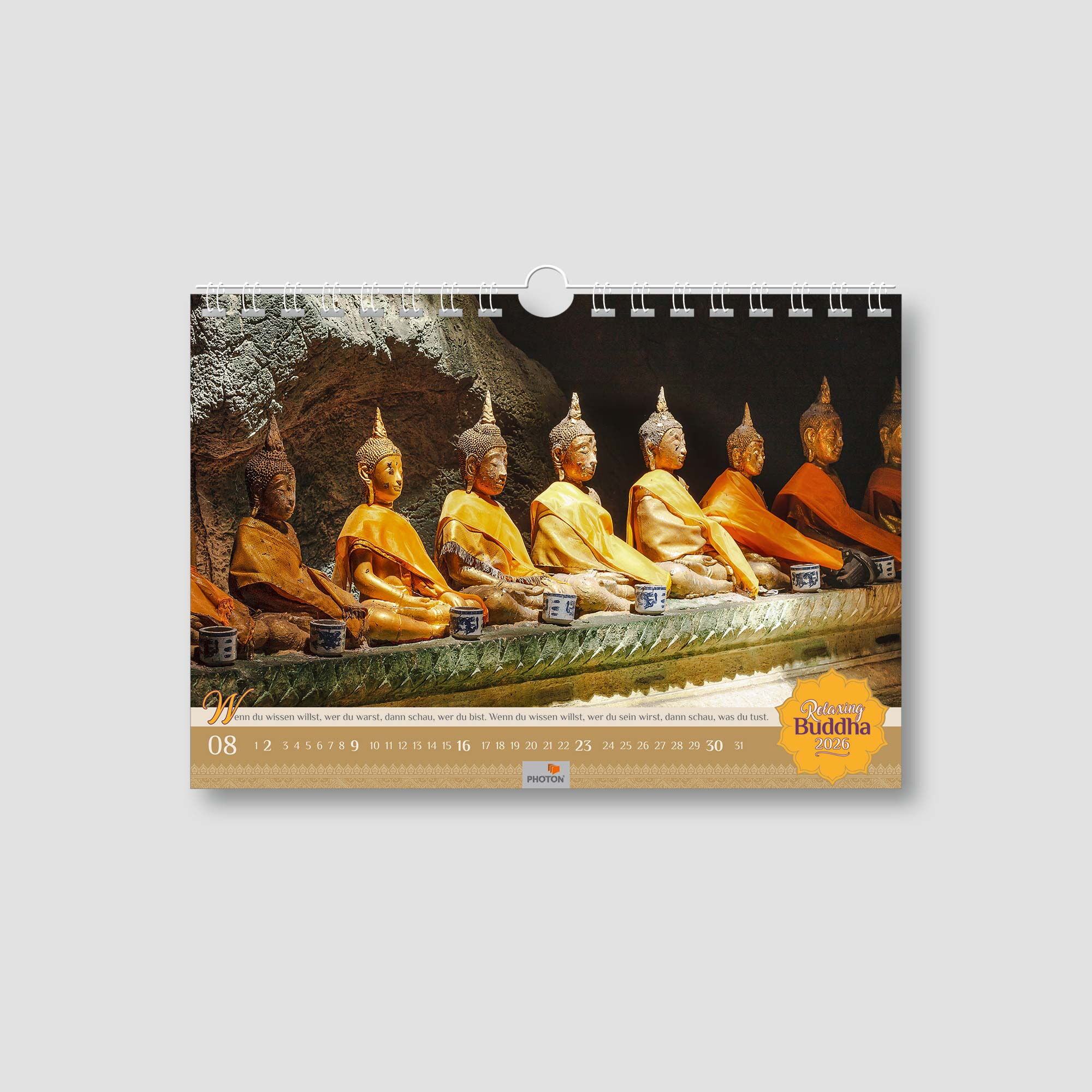 Wenn wir mal wieder vergessen haben, im Hier und Jetzt zu leben, holt uns dieser Kalender ganz sanft wieder in die Gegenwart. Ruhige Fotografien buddhistischer Kunst und Zitate laden zum Verweilen und Nachdenken ein. Für alle, die im Alltag nach einem Hauch Balance und innerer Zufriedenheit suchen. Denn: “Wir sind, was wir denken. Alles, was wir sind, entsteht aus unseren Gedanken.